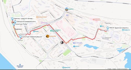 г. Дудинка: ТМК ОУ «Дудинская средняя школа № 4» (ул. Щорса, 23В) – Скульптура «Северная девушка» (Набережная площадь) – Скульптура «Рыбак» (Набережная площадь) – Декоративное сооружение «Коч» (Ул. Советская, 30) – Памятник-гурий Харитону Лаптеву (рекреационная зона Таймырского краеведческого музея, ул. Советская, 30) – Таймырский краеведческий музей (ул. Советская, 30). |