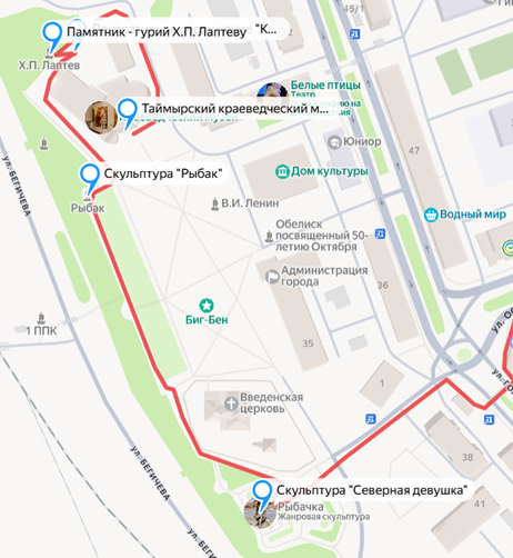 От центрального входа школы № 4 начинаем движение в сторону набережной реки Енисей. Двигаемся прямо по улице Строителей (около 80 метров) до пересечения с улицей Щорса. На пересечении улицы Щорса и улицы Всесвятского переходим дорогу, и по улице Всесвятского выходим на улицу Горького, с которой доходим до площади города. Останавливаемся возле скульптуры «Северная девушка». Затем поворачиваем налево и продолжаем движение вдоль береговой линии по Набережной площади (расстояние около 150 метров) в сторону пассажирского причала. В конце пешеходной дорожки расположена скульптура «Рыбак». От нее продолжаем движение прямо по набережной еще 20 метров в сторону пассажирского причала к рекреационной зоне Таймырского краеведческого музея. Справа от пешеходной дорожки находится декоративное сооружение «Коч». Поворачиваем налево к памятнику-гурию Харитону Лаптеву. Завершаем маршрут, пройдя 30 метров от памятника к центральному входу Таймырского краеведческого музея (ул. Советская, 30). |