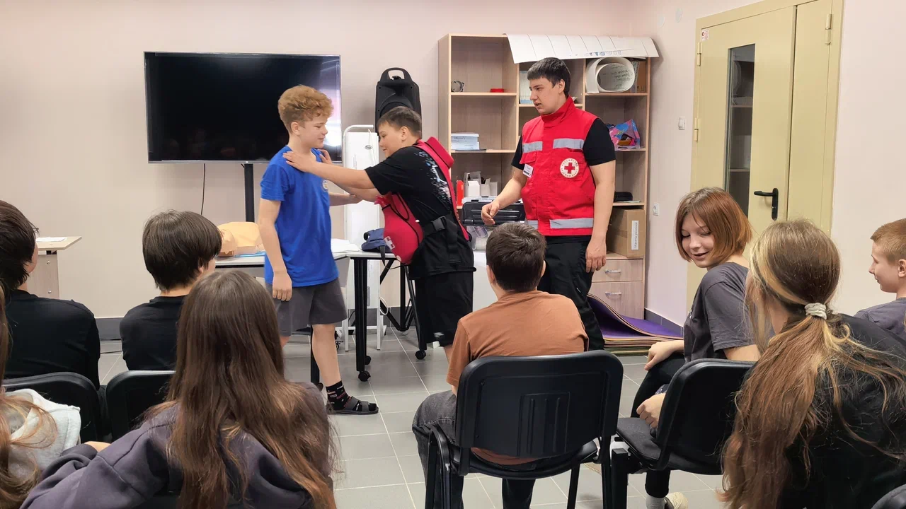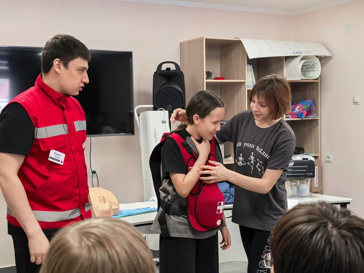 Финальный практический день был самым ответственным. Он начался с освоения навыков оказания первой помощи: ребята учились останавливать кровотечения, накладывать жгуты и давящие повязки, а также отрабатывали алгоритм сердечно-лёгочной реанимации (СЛР) на манекенах.