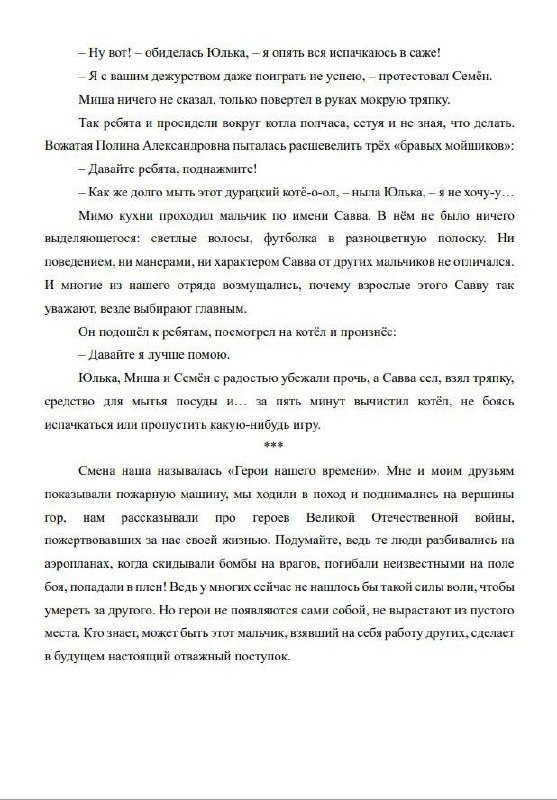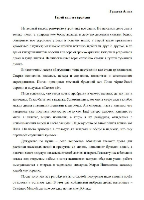 Участница краевой летней профильной смены 2025 года «Герои нашего времени» Аглая Гурьева учится в средней школе № 145 г. Красноярска. По возвращении со смены, прошедшей на детско-юношеской туристской базе «Багульник», она написала рассказ с одноименным названием. Литературная работа Аглаи, которой удалось очень точно уловить смысл смены «Герои нашего времени», заняла 2 место в городском литературном конкурсе «Взлетай!».
